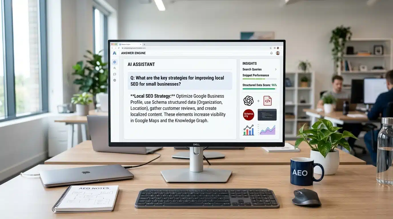 A modern desktop workspace displaying an AI assistant delivering a direct business answer, representing Answer Engine Optimization in action.